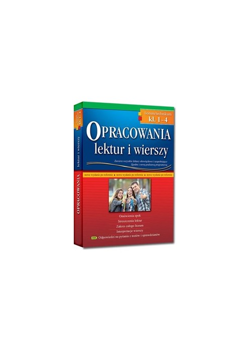 Opracowania lektur i wierszy to znana i lubiana przez kolejne pokolenia uczniów seria książek. Najnowsza część została przygotowana z myślą o uczniach uczęszczających do zreformowanych szkół średnich. Obejmuje materiał wymagany w czterech klasach liceum.